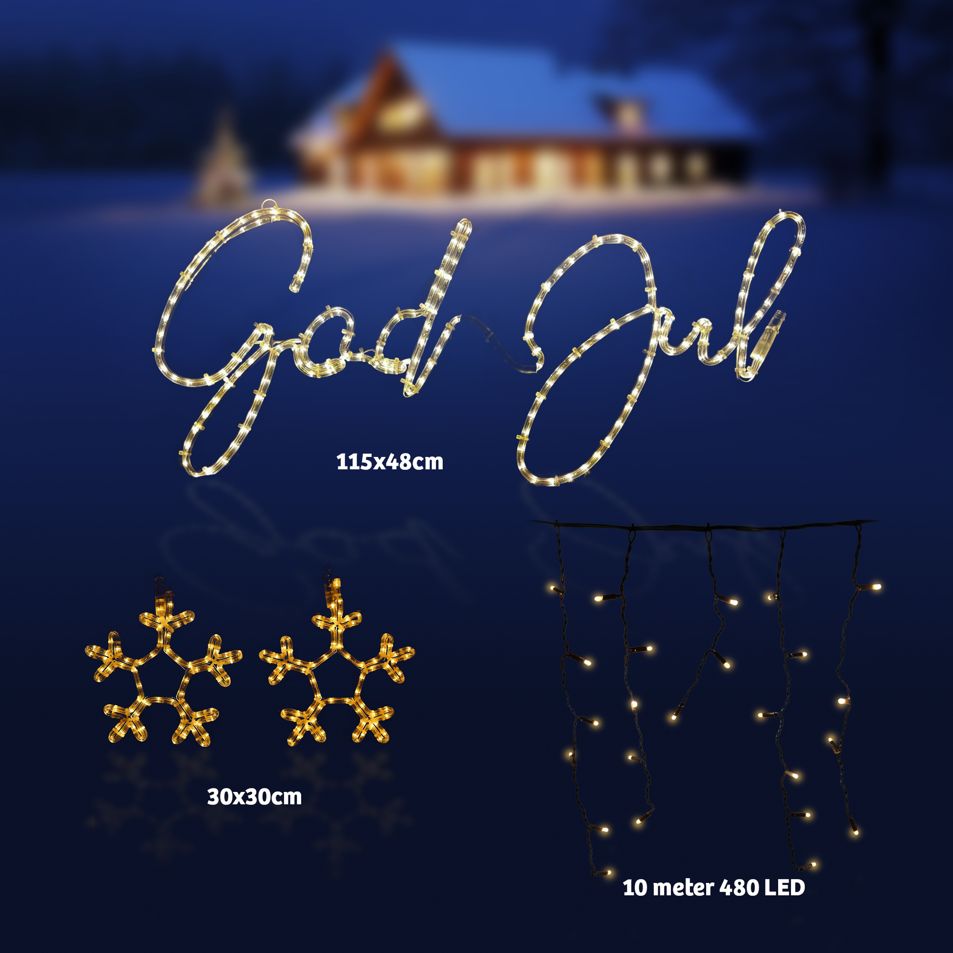 Denne pakken med utendørs julelys gir deg en kombinasjon av fine design med ulike bruksområder. Et klassisk God Jul skilt i LED, en flott og solid istappslynge i best kvalitet og 2 små snøkrystaller. Her har du enten muligheten til å fylle på din julelysdekorasjon eller så er det også en fin startpakke for julelys utendørs.