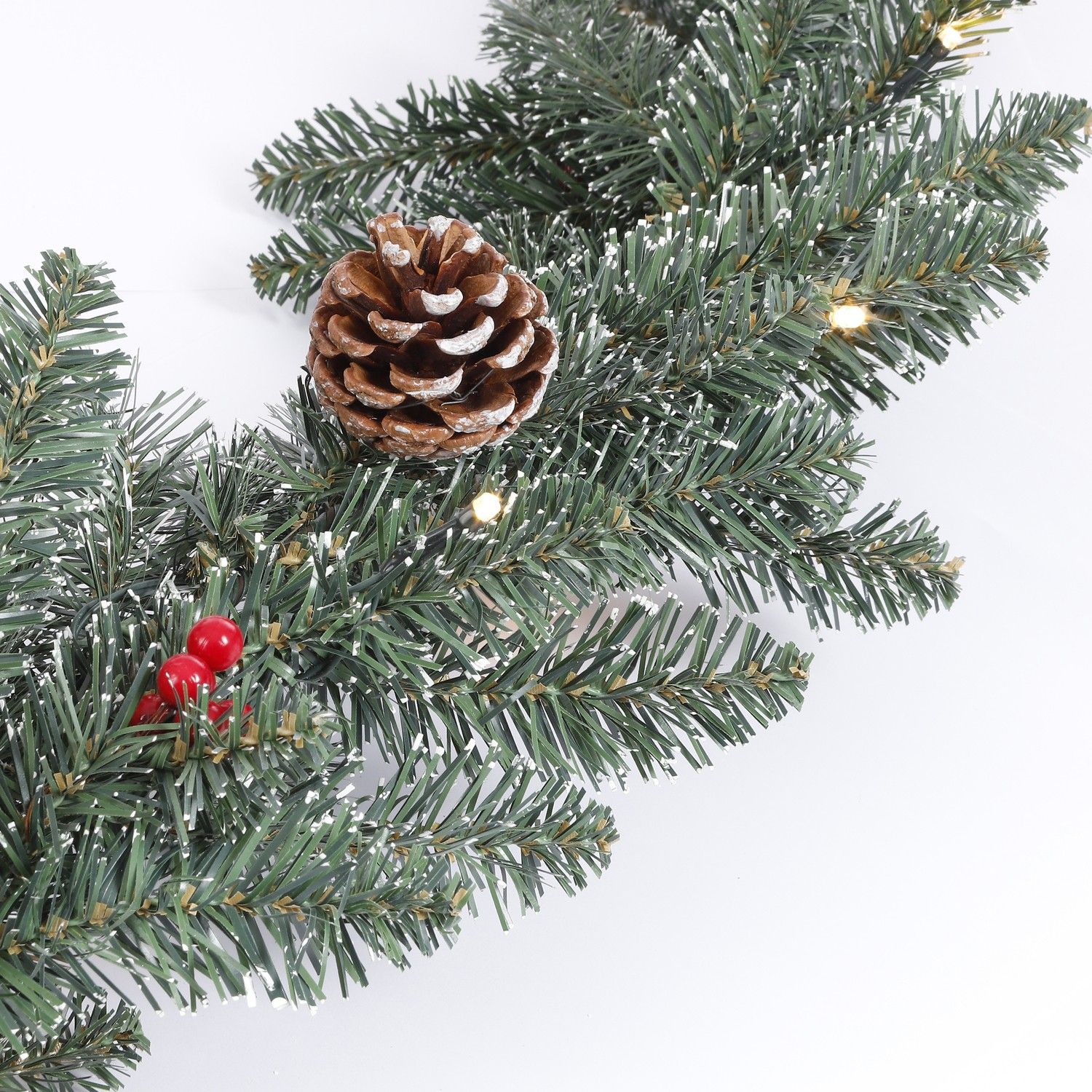 Girlander med kongler og røde bær utstråler alt som er jul! Kransen består av solide, brune greiner med myke, grønne nåler festet. De hvite tuppene får det til å se ut som om nålene er frosne. Kransen er dekorert med kongler og røde bær som gjør den enda mer attraktiv. For enkelhets skyld er kransen allerede utstyrt med 30 varmhvite LED-lys. Du trenger ikke gjøre noe annet! Belysningen fungerer på 3 AA-batterier, så du slipper støpsler og stikkontakter. Plasser den på et skap eller vinduskarm, eller heng den for eksempel på rekkverket. Girlanden har en lengde på 2,7 meter!