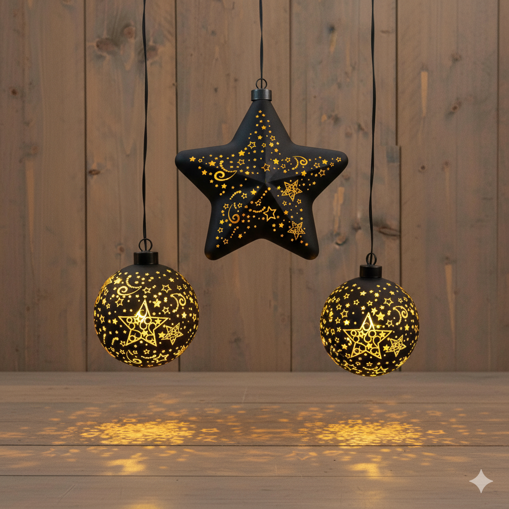 Her får du mye flott julestemning for pengene. Sett med tre hengende dekorelementer fra Coen Bakker. Flott stjerne og to flotte dekorkuler i eksklusiv svart med varmhvite LED lys